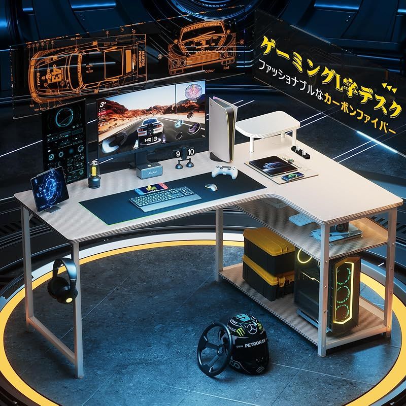 - 机・テーブル > パソコンデスク > ゲーミングデスク カーボン調 コンセント付き パソコンデスク L字 ラック付き GTRACING ゲーミングデスク パソコンデスク L字 カーボン調 コンセント
